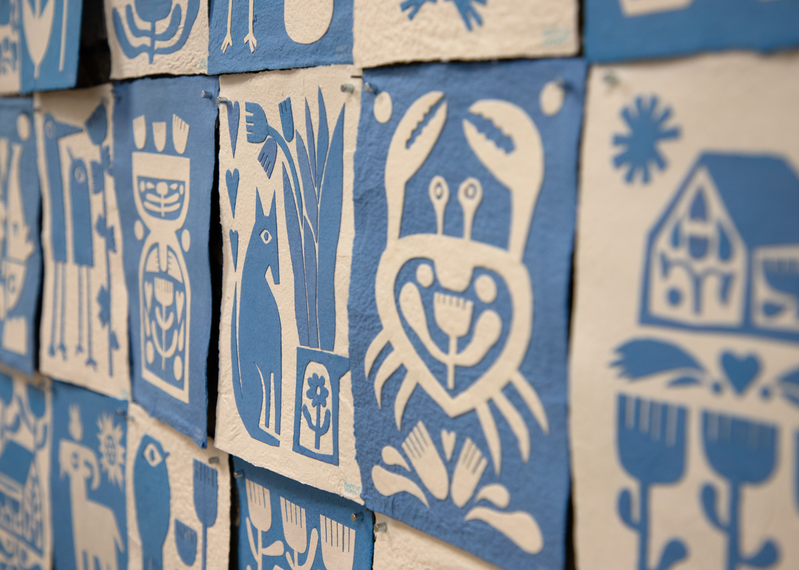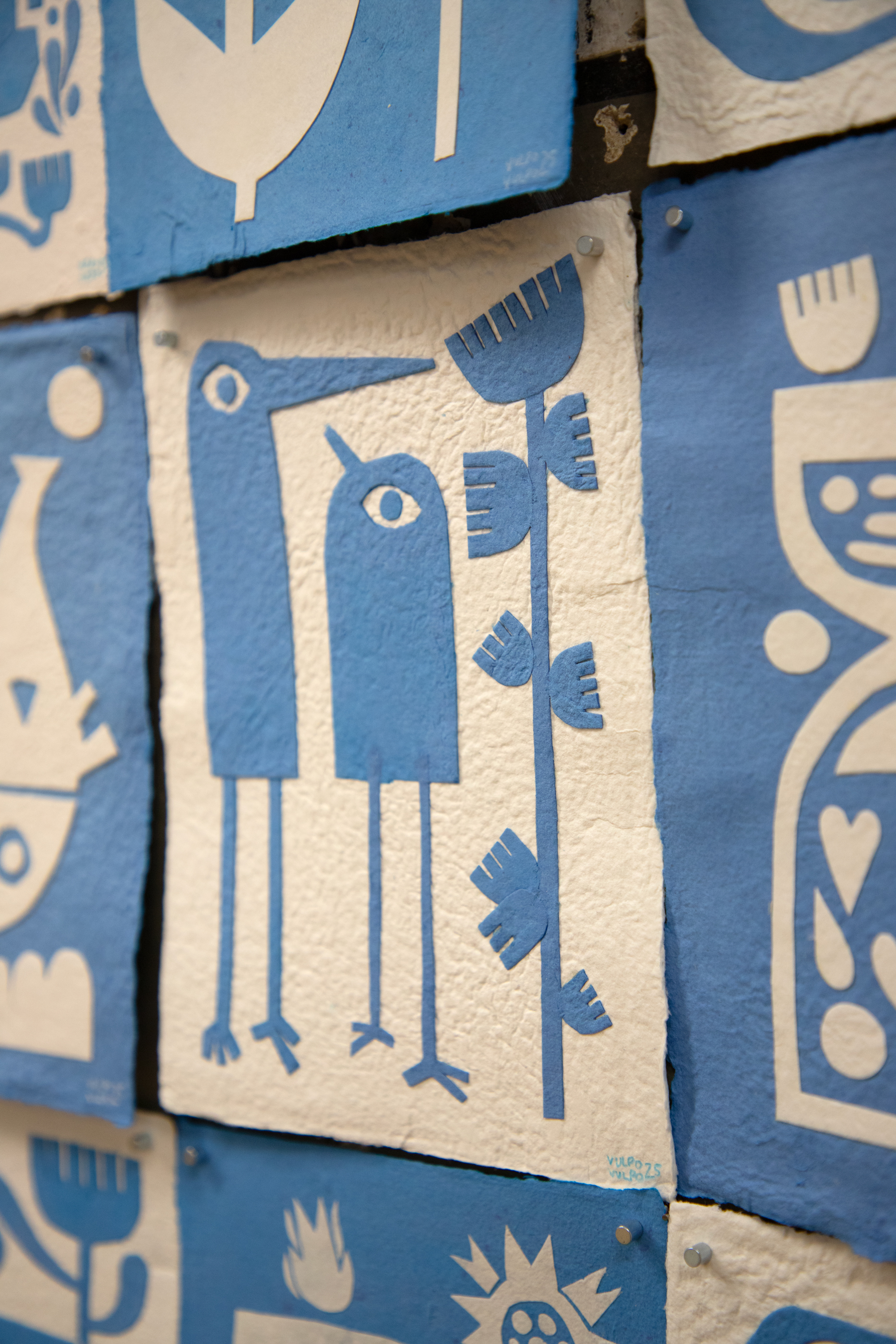 Le papier utilisé pour l'œuvre a été fabriqué à partir d'anciennes œuvres de l'artiste. Recyclées, trempées, broyées, pressées puis séchées, ses anciennes créations renaissent sous la forme d'une composition de 40 collages bicolores.