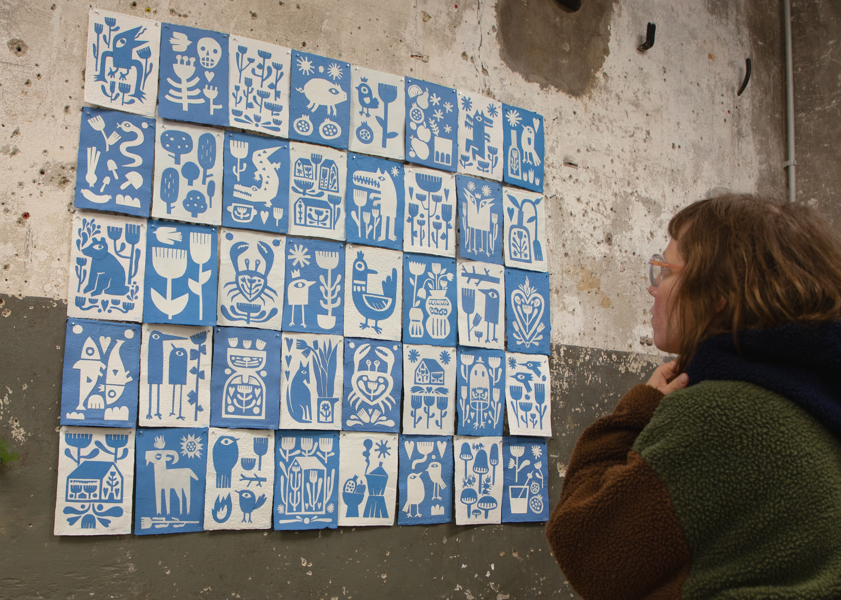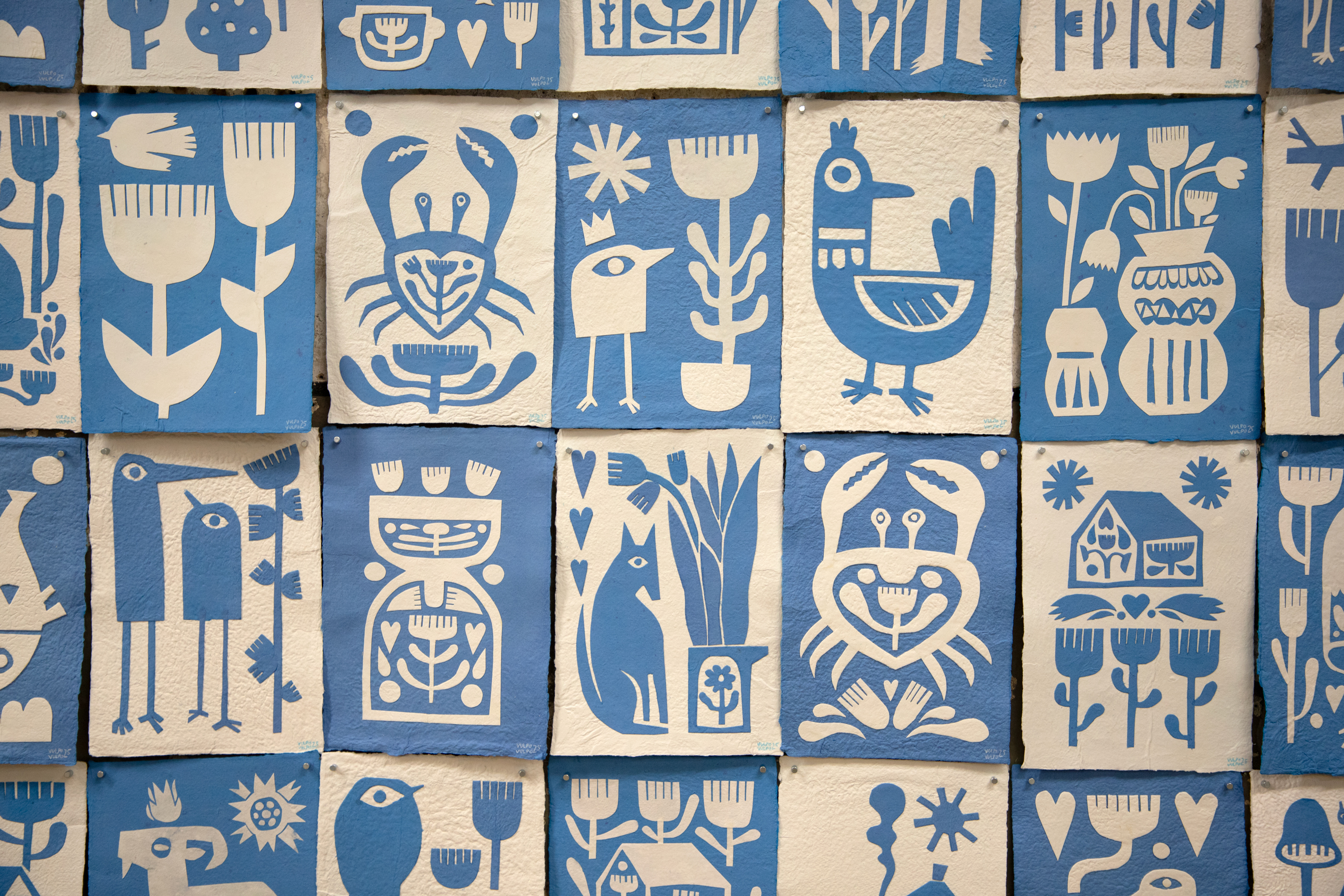 Fleurs, animaux, figures chimériques, symboles et objets du quotidien s’entremêlent pour former une mosaïque graphique et vibrante.